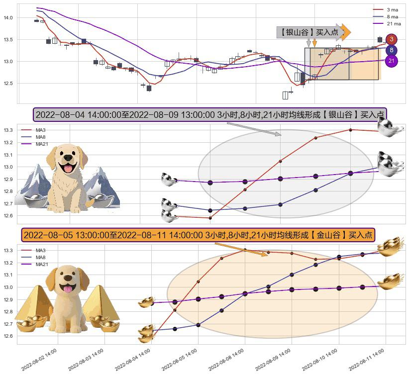 ⚄ 2022-08-05 14:00:00-小时至2022-08-11 14:00:00-小时显现 3小时-8小时-21小时均线 【金山谷】买入点 其再次确认了买入信号,可靠性更强,买入