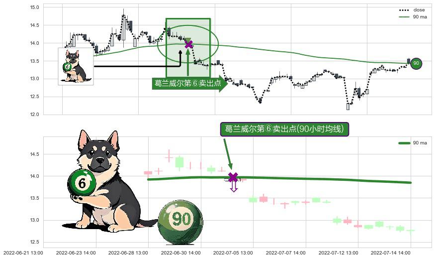 ⚀ 2022-07-04 13:00:00-小时显现 葛兰威尔均线 90小时均线 第⑥卖出点 走势反转见顶信号,后市看跌,卖出信号