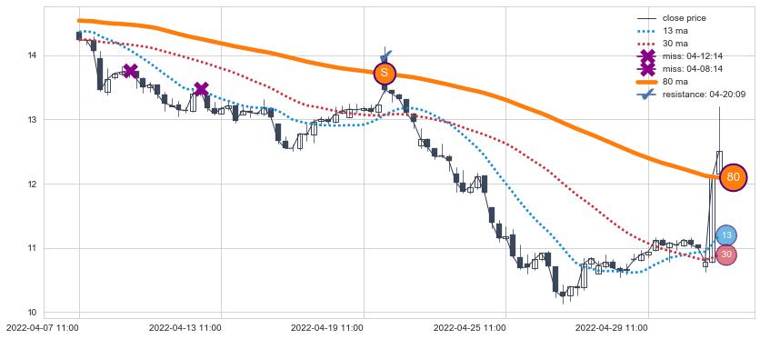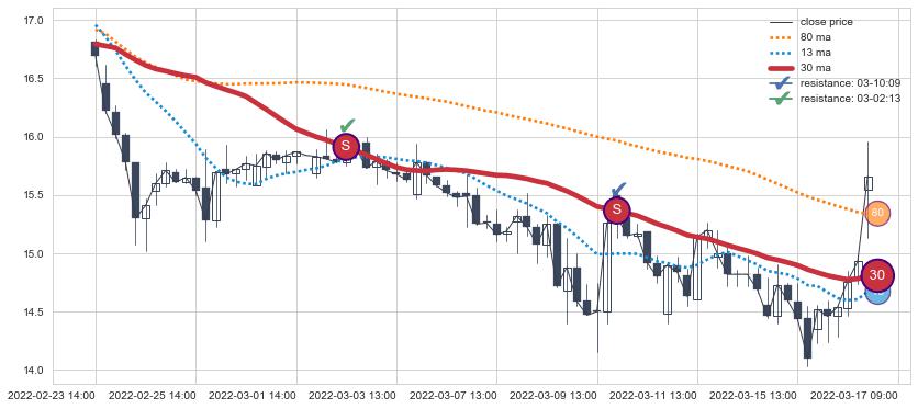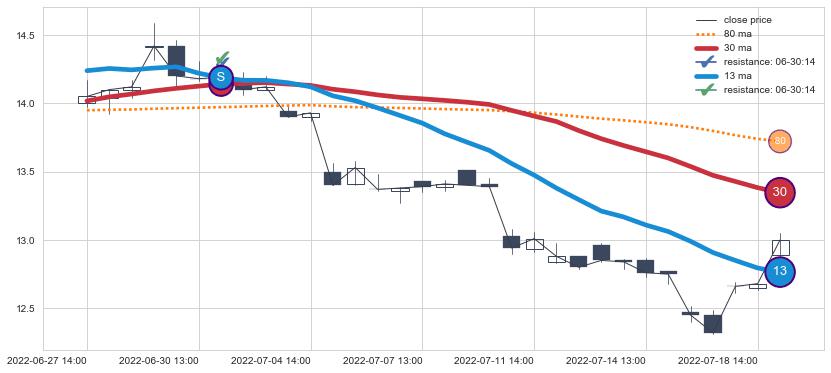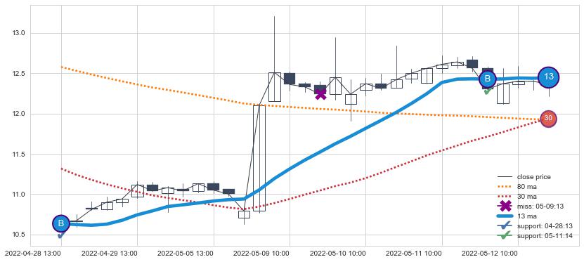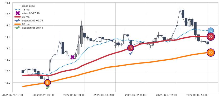 ⚂ 2022-07-11 13:00:00-小时均线向下破位,2022-08-11 14:00:00-小时重新上穿突破均线,均线支撑再次生效