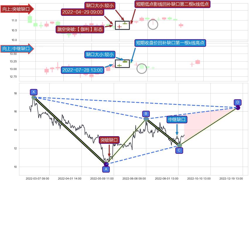 ➣ 突破缺口形成后,后续k已经超过14根,跳空突破【伽利】形态关键点后, 出现【轻微回踩】迹象,短期低点影线回补缺口第二根k线低点