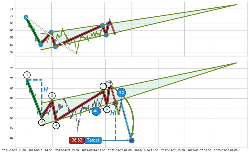 ➢ 最小中继整理跌幅→𝐇: 18.74 (𝐇楔型旗杆的长度:楔型起点→顶点)