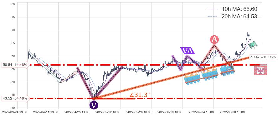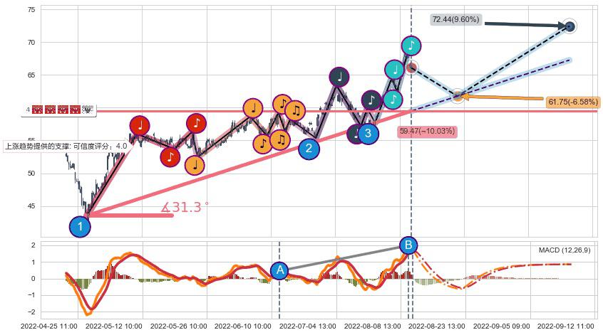 从2022-04-26 14:00至2022-08-12 14:00,共包含253个小时,阶段股价上涨44.20%,阶段股价变动位移路程比: 1 : 5,上涨趋势角度: 31.3