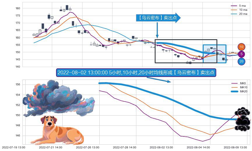 形态多维评估: ⚀ 2022-07-26 13:00:00小时-2022-08-08 14:00:00小时显现 5小时-10小时-20小时均线 【乌云密布】卖出点 看空信号,后市看跌,卖出