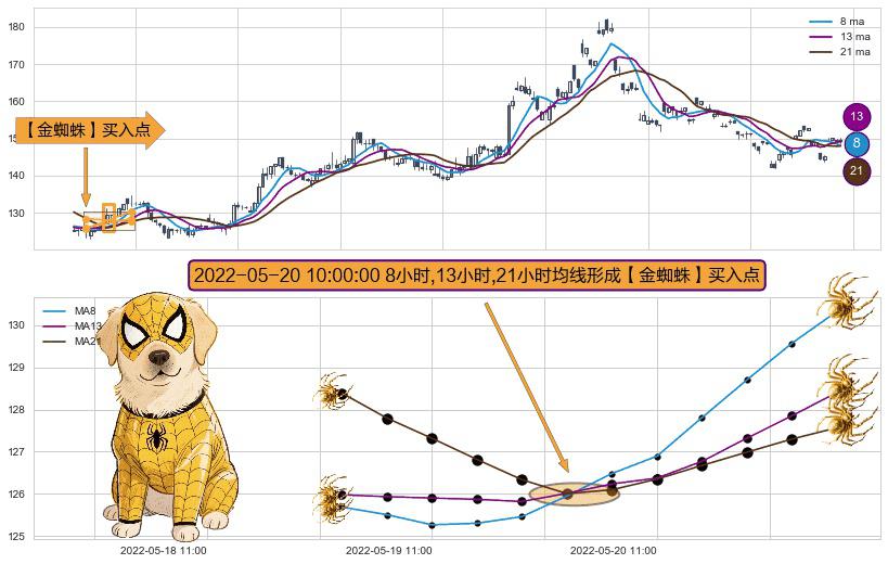 形态多维评估: ⚀ 2022-05-20 10:00:00小时显现 8小时-13小时-21小时均线 【金蜘蛛】买入点 看多信号,后市看涨,买入