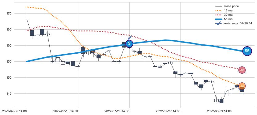 下跌趋势07-06 14:00-08-04 14:00,均线55确认关键阻力1处