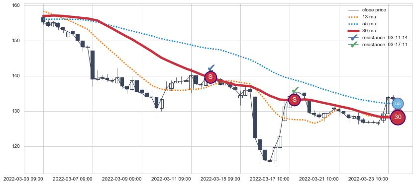下跌趋势03-03 09:00-03-23 11:00,均线30确认关键阻力2处