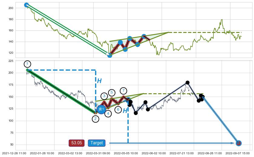 从2021-12-29 10:00至2022-02-08 11:00,共包含118个小时,阶段股价下跌-34.54%,阶段股价变动位移路程比: 1 : 2
