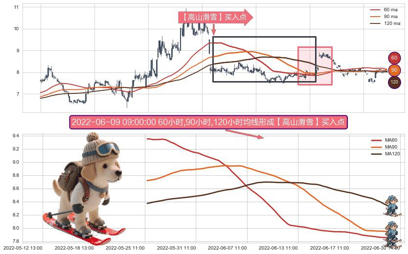 ⚀ 2022-05-25 13:00:00小时-2022-06-28 13:00:00小时显现 60小时-90小时-120小时均线 【高山滑雪】买入点 看多信号,后市看涨,买入