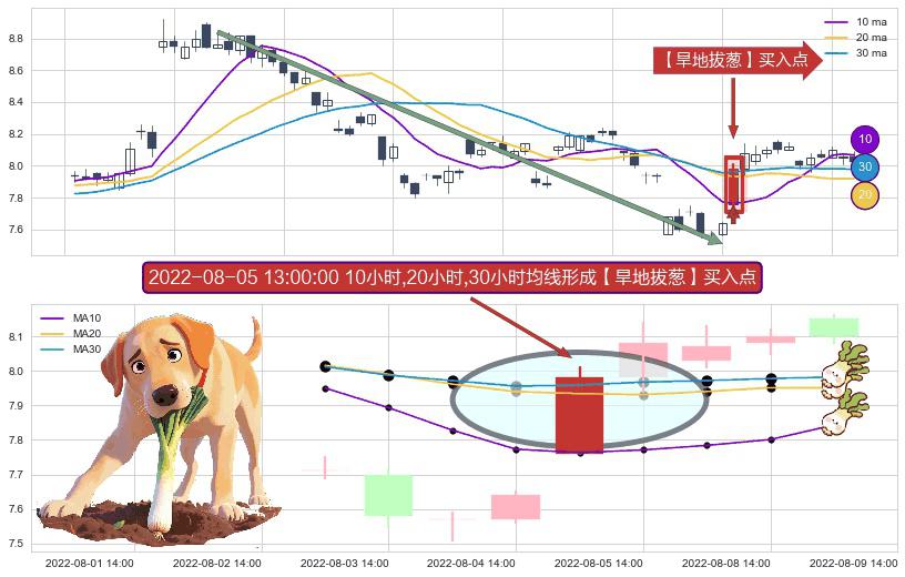 ⚀ 2022-08-05 13:00:00小时显现 10小时-20小时-30小时均线 【旱地拔葱】买入点 看多信号,后市看涨,买入