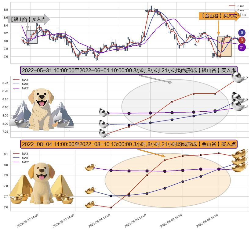 ⚃ 2022-08-05 13:00:00-小时至2022-08-10 13:00:00-小时显现 3小时-8小时-21小时均线 【金山谷】买入点 其再次确认了买入信号,可靠性更强,买入