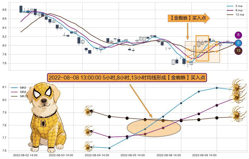 ⚀ 2022-08-08 13:00:00小时显现 5小时-8小时-13小时均线 【金蜘蛛】买入点 看多信号,后市看涨,买入