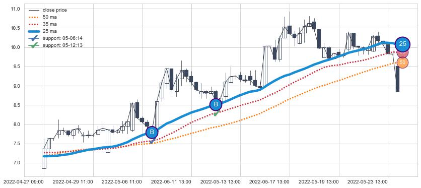 ⚂ 2022-06-21 14:00:00小时突然冒出一根大阳线,一下子顶穿三条均线且收盘价收在各条均线之上
