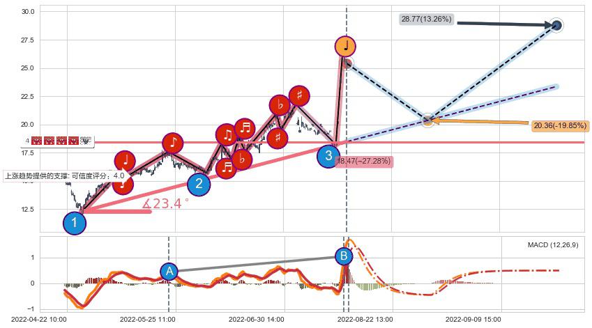 从2022-04-27 09:00至2022-08-12 14:00,共包含246个小时,阶段股价上涨78.24%,阶段股价变动位移路程比: 1 : 4,上涨趋势角度: 23.4