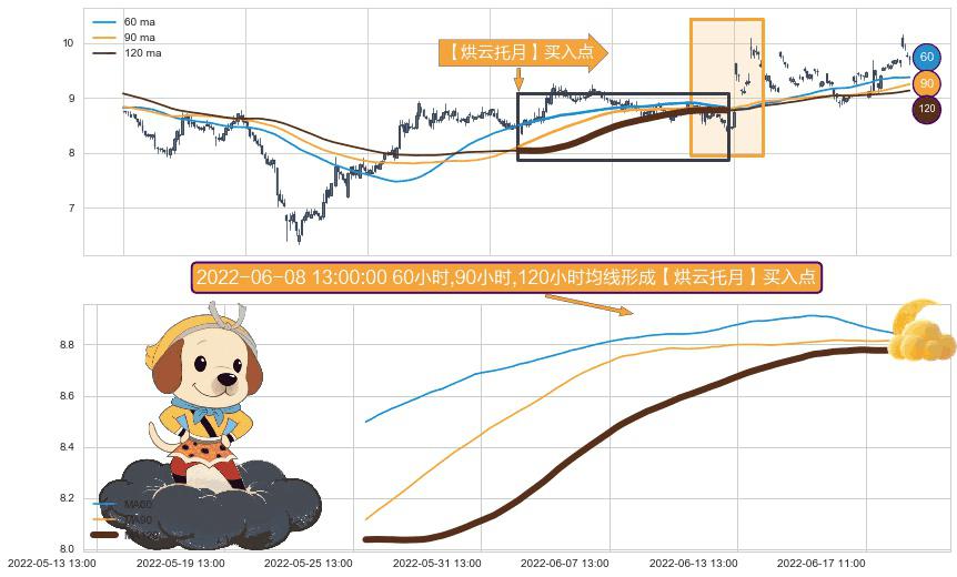 ⚀ 2022-05-26 09:00:00小时-2022-06-22 13:00:00小时显现 60小时-90小时-120小时均线 【烘云托月】买入点 看多信号,后市看涨,买入