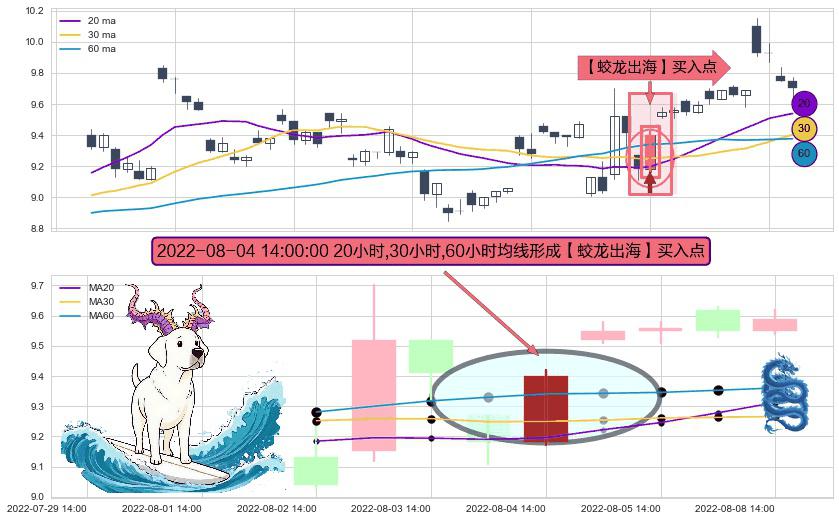 ⚀ 2022-08-04 14:00:00小时显现 20小时-30小时-60小时均线 【蛟龙出海】买入点 看多信号,后市看涨,买入