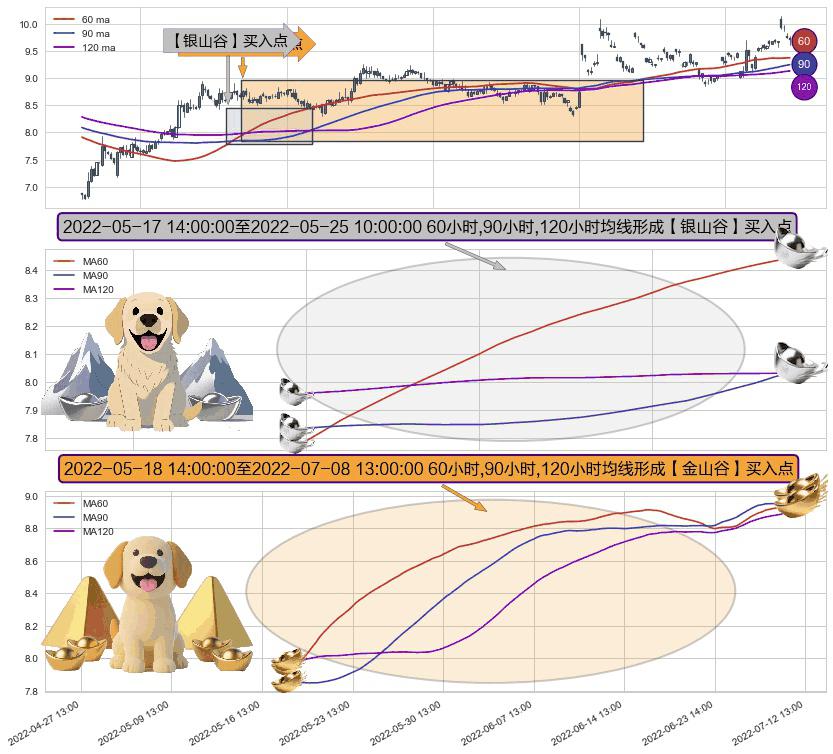 ⚃ 2022-05-19 09:00:00-小时至2022-07-08 13:00:00-小时显现 60小时-90小时-120小时均线 【金山谷】买入点 其再次确认了买入信号,可靠性更强,买入