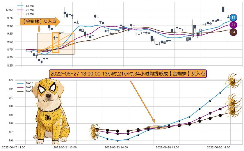 ⚀ 2022-06-27 13:00:00小时显现 13小时-21小时-34小时均线 【金蜘蛛】买入点 看多信号,后市看涨,买入