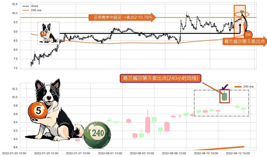⚀ 2022-08-11 13:00:00-小时显现 葛兰威尔均线 240小时均线 第⑤卖出点 上升趋势均值回复的短线回落信号,后市看跌,卖出信号