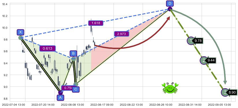 ➣ 未完成【螃蟹】形态起点X: 06-30:13, 已到达C点: 08-02:14, 预测最终D点: 08-25:15, 共125交易小时