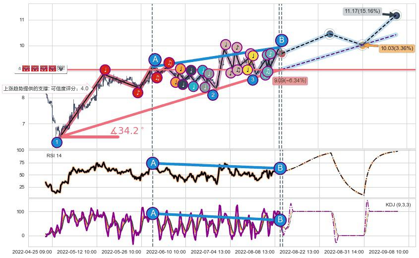 ♘ 在最后的上升阶段2022-04-27 09:00至2022-08-12 14:00存在 持续未破位的支撑位 ,支撑价格9.09,支撑可信任强度82.47%,其距离最后价格9.70相差 -6.34%