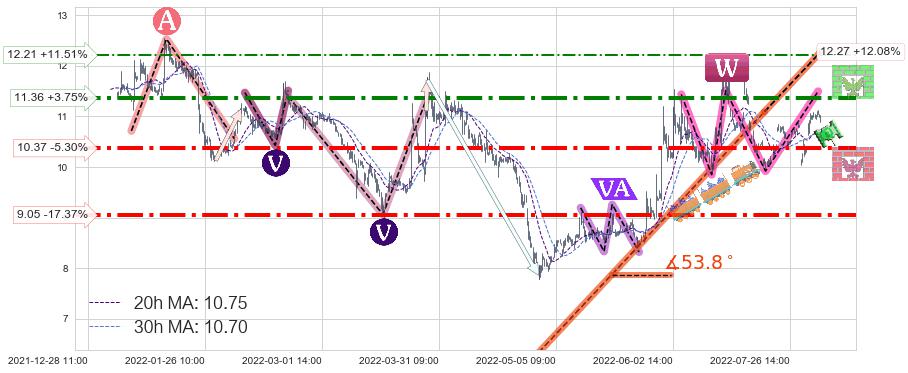 ♘ 阻力价格位12.21,可信任强度54.00%,距离最后交易2022-08-12 14:00形成的收盘价格10.95相差 +11.51%