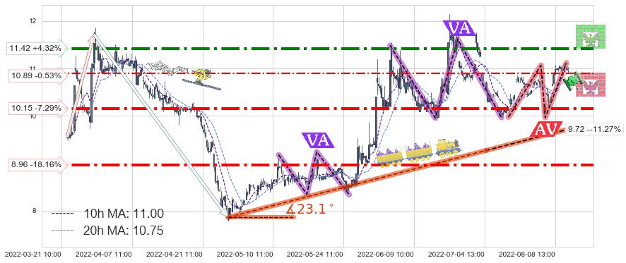 ♘ 支撑价格位10.89,可信任强度47.79%,距离最后交易2022-08-12 14:00形成的收盘价格10.95相差 -0.53%