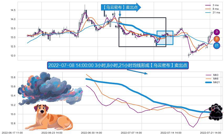 形态多维评估: ⚀ 2022-06-28 14:00:00小时-2022-07-20 14:00:00小时显现 3小时-8小时-21小时均线 【乌云密布】卖出点 看空信号,后市看跌,卖出