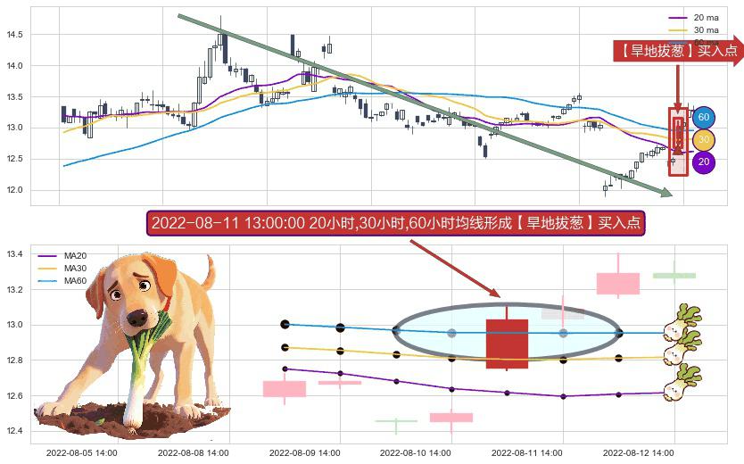 形态多维评估: ⚀ 2022-08-11 13:00:00小时显现 20小时-30小时-60小时均线 【旱地拔葱】买入点 看多信号,后市看涨,买入