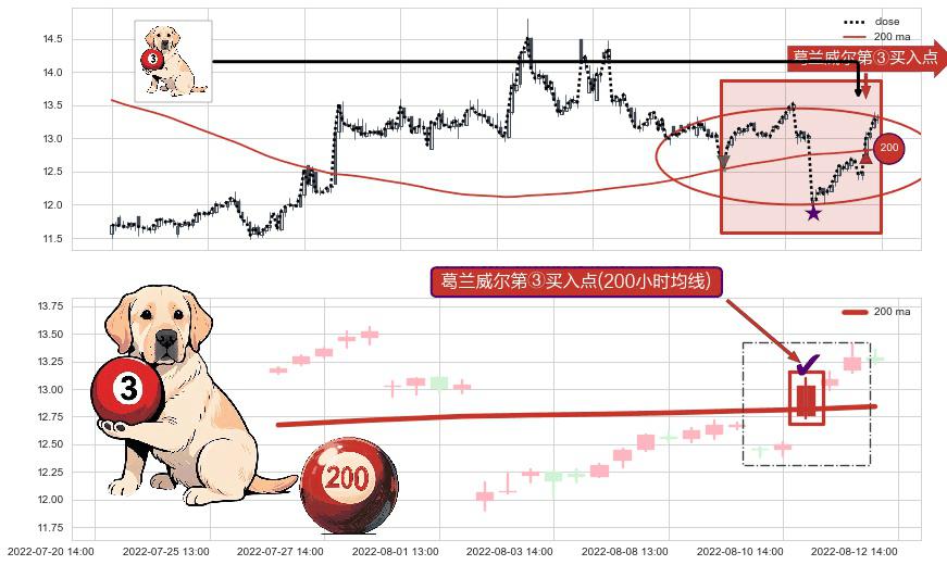 形态多维评估: ⚀ 2022-08-11 13:00:00-小时显现 葛兰威尔均线 200小时均线 第③买入点 上升趋势的中继信号,后市看涨,买进信号