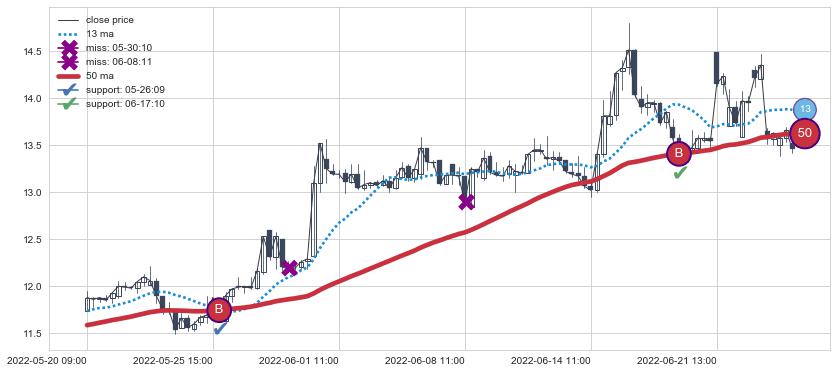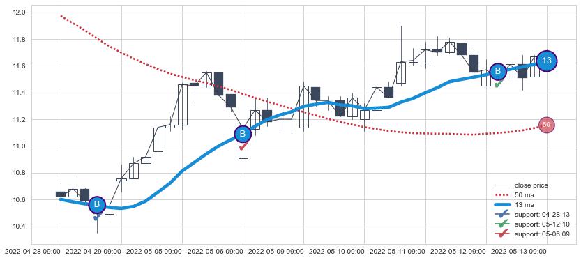 上涨趋势04-28 09:00-05-13 09:00,均线13确认关键支撑3处