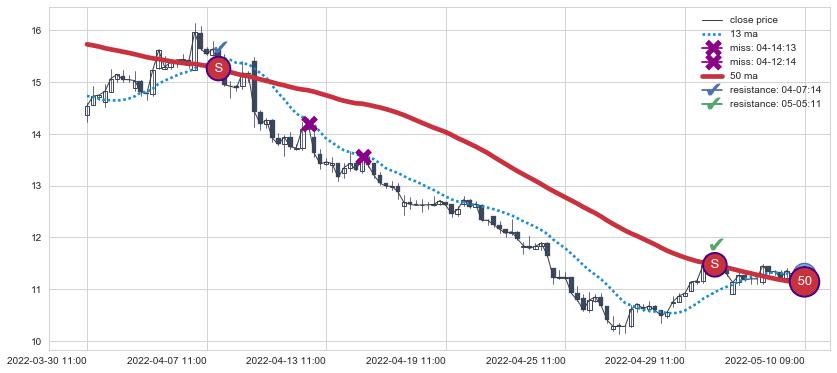下跌趋势03-30 11:00-05-10 09:00,均线50确认关键阻力2处