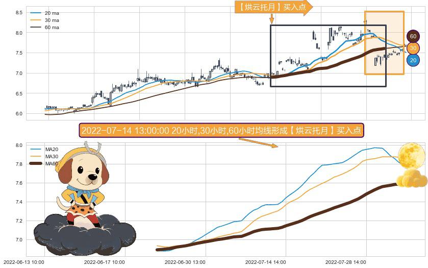 ⚀ 2022-06-22 13:00:00小时-2022-08-04 14:00:00小时显现 20小时-30小时-60小时均线 【烘云托月】买入点 看多信号,后市看涨,买入