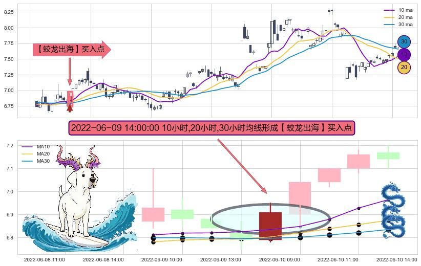 ⚀ 2022-06-09 14:00:00小时显现 10小时-20小时-30小时均线 【蛟龙出海】买入点 看多信号,后市看涨,买入