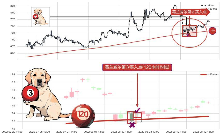 ⚀ 2022-08-04 13:00:00-小时显现 葛兰威尔均线 120小时均线 第③买入点 上升趋势的中继信号,后市看涨,买进信号