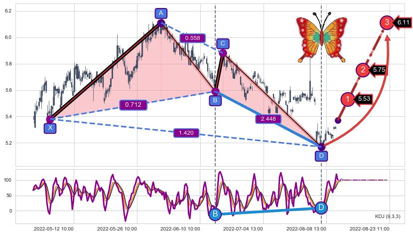 ➣ 已完成【蝴蝶】形态起点X: 05-06:11, 终点D: 08-04:13, 共216交易小时