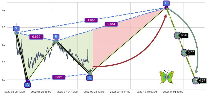 ➣ 未完成【蝴蝶】形态起点X: 04-14:14, 已到达C点: 08-04:13, 预测最终D点: 10-18:09, 共568交易小时