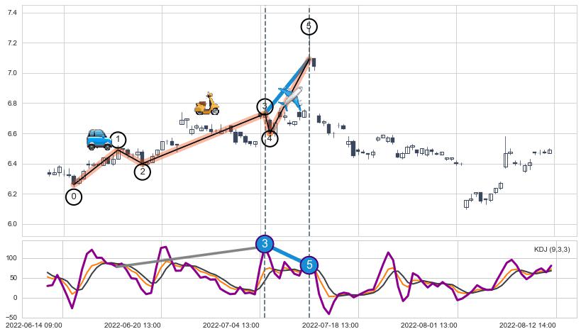 ➣ 第三,五驱动浪端点:【KDJ】走势出现【常规背离 & 反转信号】背离程度83.33%,背离夹角角度120.9˚,背离程度较大
