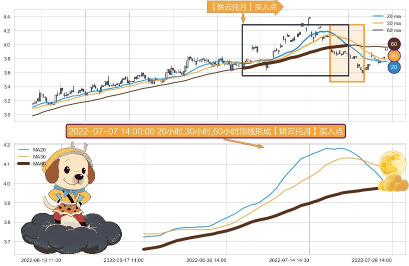 形态多维评估: ⚀ 2022-06-17 11:00:00小时-2022-07-28 13:00:00小时显现 20小时-30小时-60小时均线 【烘云托月】买入点 看多信号,后市看涨,买入