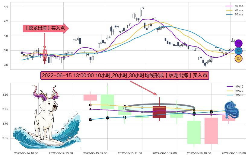 形态多维评估: ⚀ 2022-06-15 13:00:00小时显现 10小时-20小时-30小时均线 【蛟龙出海】买入点 看多信号,后市看涨,买入