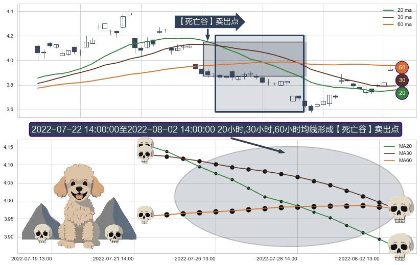 形态多维评估: ⚀ 2022-07-25 13:00:00-小时至2022-08-02 14:00:00-小时显现 20小时-30小时-60小时均线 【死亡谷】卖出点 看空信号,后市看跌,卖出