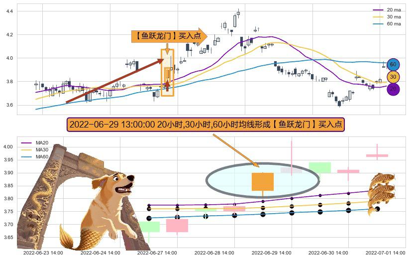 形态多维评估: ⚀ 2022-06-29 13:00:00小时显现 20小时-30小时-60小时均线 【鱼跃龙门】买入点 看多信号,后市看涨,买入