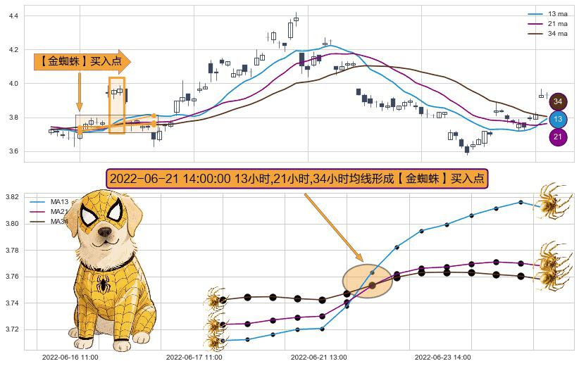 形态多维评估: ⚀ 2022-06-21 14:00:00小时显现 13小时-21小时-34小时均线 【金蜘蛛】买入点 看多信号,后市看涨,买入