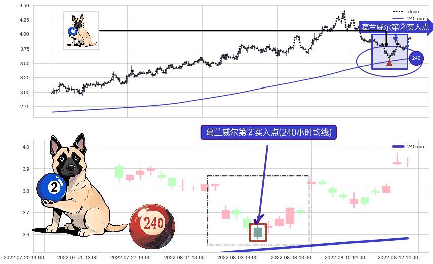形态多维评估: ⚀ 2022-08-03 14:00:00-小时显现 葛兰威尔均线 240小时均线 第②买入点 上升趋势的中继信号,后市看涨,买进信号