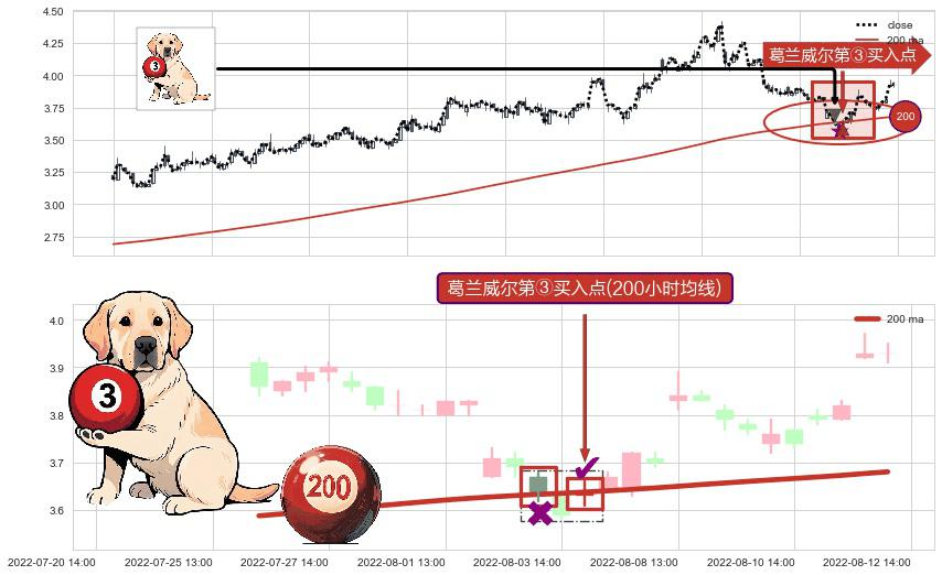 形态多维评估: ⚀ 2022-08-04 13:00:00-小时显现 葛兰威尔均线 200小时均线 第③买入点 上升趋势的中继信号,后市看涨,买进信号