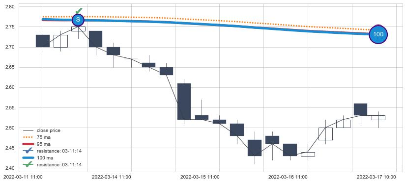 下跌趋势03-11 11:00-03-17 10:00,均线100, 95确认关键阻力1处