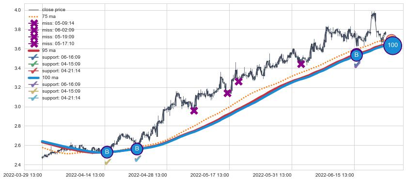 上涨趋势03-29 13:00-06-28 14:00,均线100, 95确认关键支撑3处