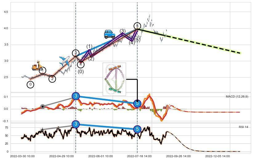 ➣ 突破缺口形成后,后续k已经超过14根,跳空突破波浪理论(5浪)关键点后, 出现【轻微回踩】迹象,短期高点影线回补缺口第二根k线高点