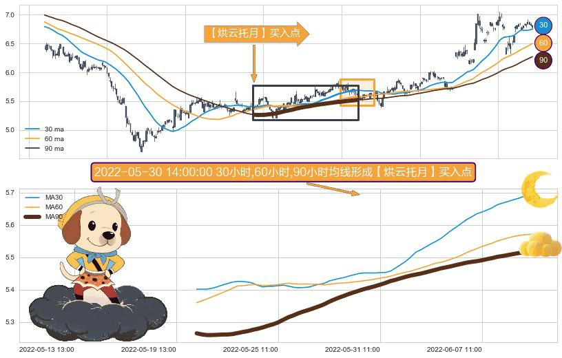⚀ 2022-05-20 11:00:00小时-2022-06-09 11:00:00小时显现 30小时-60小时-90小时均线 【烘云托月】买入点 看多信号,后市看涨,买入