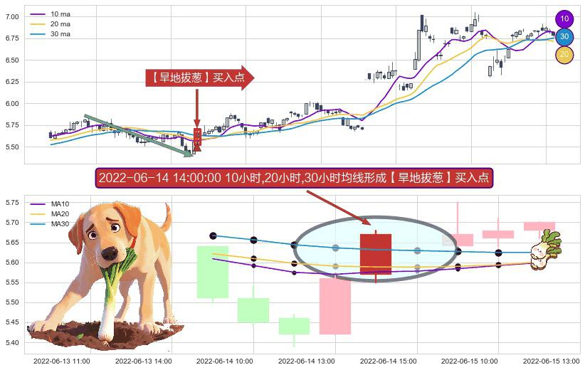 ⚀ 2022-06-14 14:00:00小时显现 10小时-20小时-30小时均线 【旱地拔葱】买入点 看多信号,后市看涨,买入