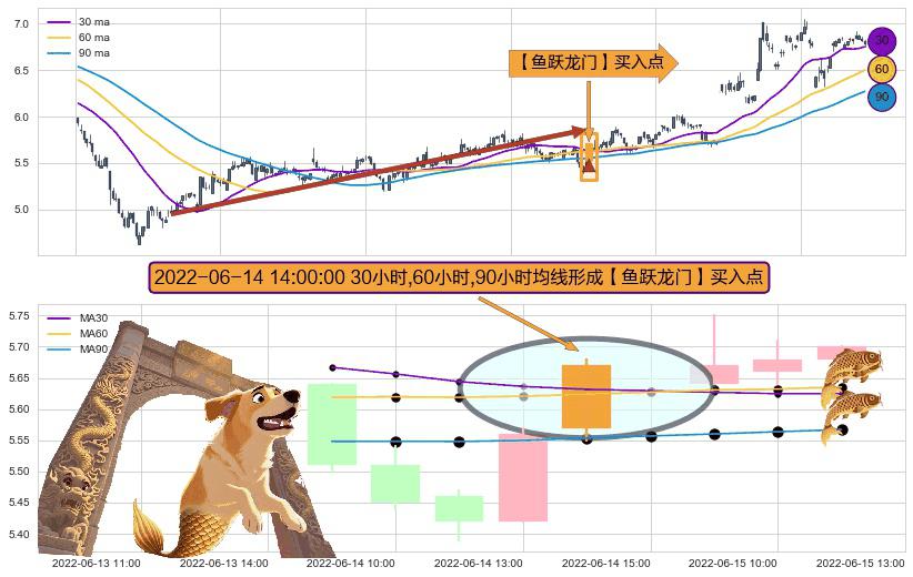 ⚀ 2022-06-14 14:00:00小时显现 30小时-60小时-90小时均线 【鱼跃龙门】买入点 看多信号,后市看涨,买入